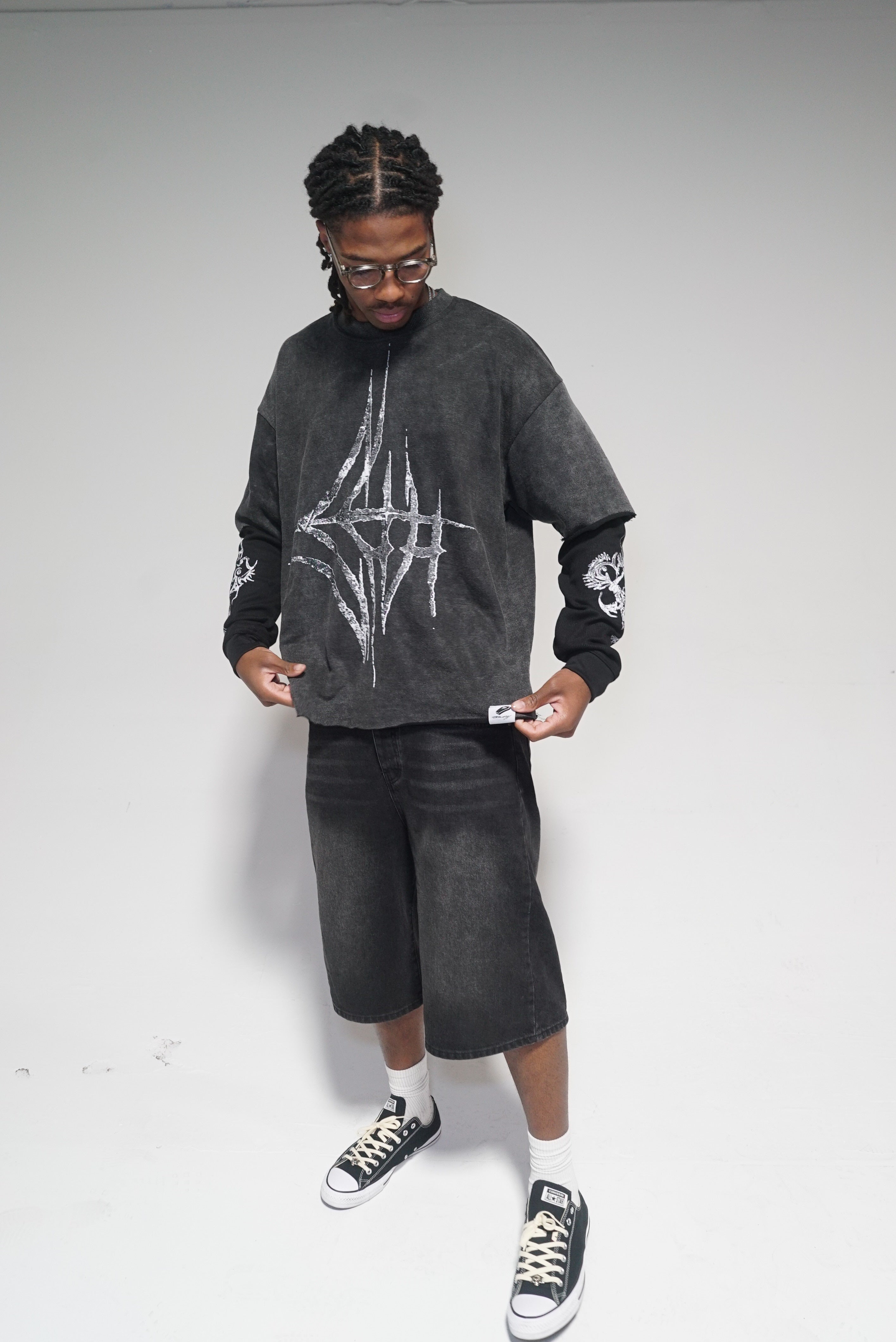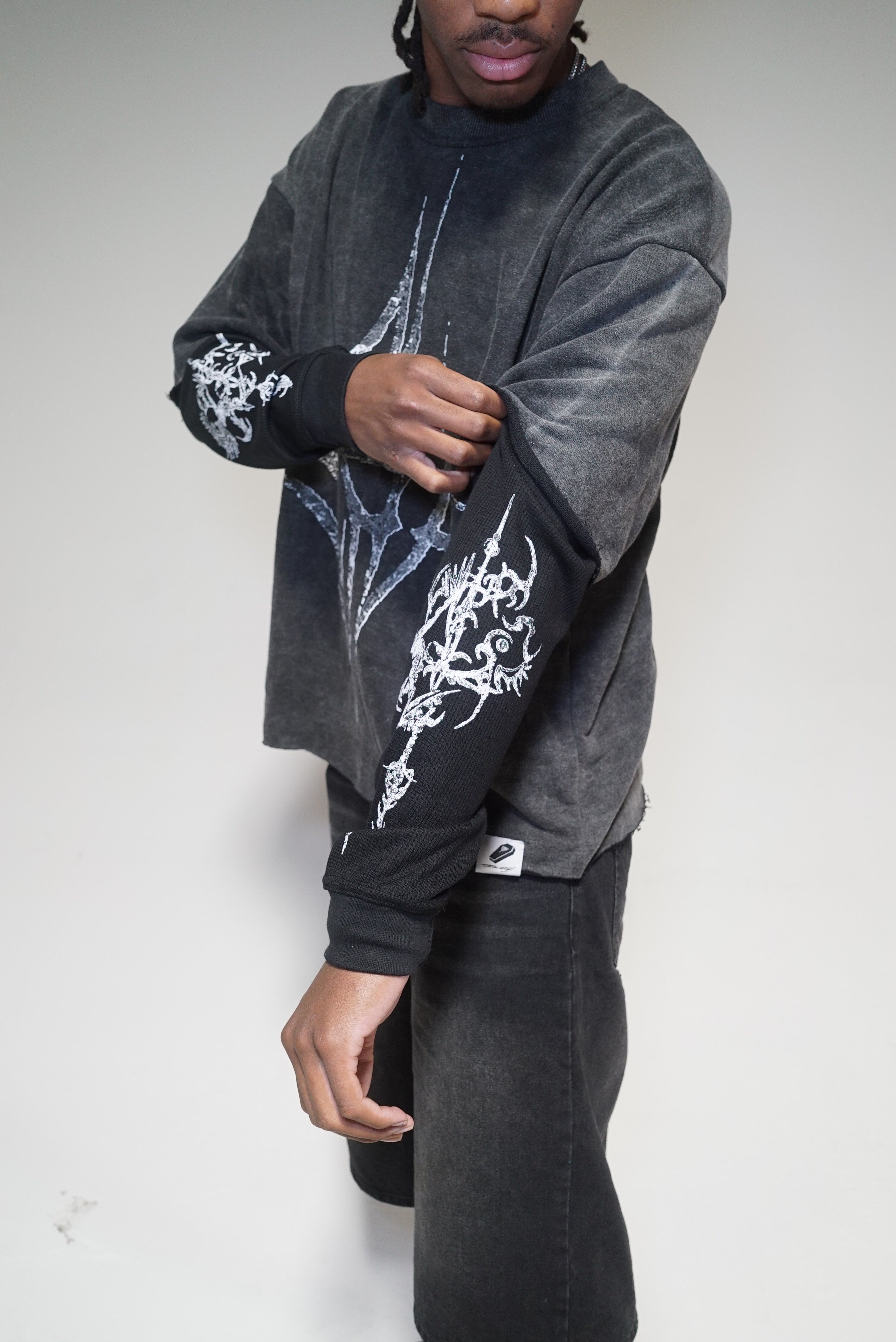 Details: The double-layered tee is crafted from premium 350 GSM French terry, featuring waffle-textured sleeves, a cropped silhouette, and a bold jumbo screen-printed graphic.